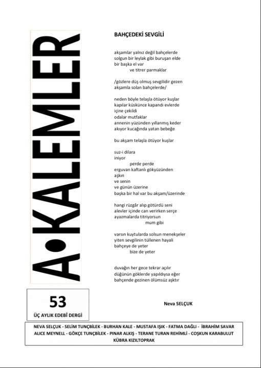 Akalemler dergisi 53. sayısı yeni bir yüzle çıktı. ![]() Kapağında Neva SELÇUK’un “Bahçedeki Sevgili” şiiriyle çıkan akalemler dergisi yeni yüzü ile okurlarıyla buluştu. Dergi edebiyatımızda kendine has yayın anlayışıyla bir yer edinmiş ve o çizgisini sürdürmede kararlı gözüküyor. Bu çerçevede “Dergimizden” başlıklı yazıda “Edebiyatımıza güç vermek isteyen ve Türkçe ses bayrağımızı geleceğe taşıma gayesi taşıyan her kaleme açık bir dergi olmaya devam edeceğiz. Sanat ve edebiyatın dünyadaki gelişmelere tepkisiz kalması beklenemez. Dünya yıkıcı bir vahşetin dehlizlerine doğru sürükleniyor. Vahşi kapitalizm davranışlarını kontrolde zorlanıyor. Filistin topraklarında insan ve çocuk katliamlarına doyamayacağı anlaşılıyor. Korsanlıklar ve eşkıyalıkların boyutu Venezuela’da yeni aşamaya sıçradı. Bu orman kanunlarının hükümranlığı demek. Çağımızın Raskolnikov’ları üniversite öğrencileri değil Devlet yönetiyorlar. Edebiyat ve Sanat bu acı gerçeği insanlığın nasıl aşabileceğini gösteren yegâne yol olduğunu düşünüyoruz.” Diyerek okuru bu düşünceye ortak olmaya çağırıyor. Selim TUNÇBİLEK yazısında Kurgan Edebiyat dergisinde yayınlanan “Yorgun Misafir” şiirini ve bu şiirden hareketle Şair Neva SELÇUK’un edebiyatımızda gelecek vadeden bir şair olduğundan söz açmış. Dergide ikinci yazı Şair Burhan KALE’ye ait. “Dağlarda Özgürsün Sen” başlıklı yazısından şiirin öneminden ve toplumsal işlevinden bahisle, “İnsana kaybolan vicdanını hatırlatmak şiirin tarihi misyonudur... Çünkü şiir merhamettir...” diyerek önemli tespitler yapıyor. Kübra KIZILTOPRAK Kitap bitti başlıklı denemesinde hayata ve umuda dönük olmak insana nasıl bir canlılık katar konusunu seçmiş. Derginin bu sayıdaki şairleri: Neva SELÇUK, Burhan KALE, Mustafa IŞIK, GÖKÇE TUNÇBİLEK çevirisiyle Alıce MEYNELL, Coşkun Karabulut aktarımıyla Terane Turan REHİMLİ yer almışlar. Hikâyeleri ile Fatma DAĞLI, İbrahim SAVAR, Pınar ALKIŞ gelecek için ışık saçan zevkle okuyacağınız hikayelerin yazarları. Dergiyi PDF olarak derginin www.akalemler.com internet sitesinden talep edebilirsiniz. Akalemler dergisine eserlerinizi göndermek için akalemlerdergisi@gmail.com e-posta adresini kullanabilirsiniz.